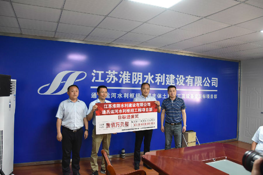 最后,莊總代表集團公司向通呂運河水利樞紐工程項目部頒發(fā)了5月30日水下驗收節(jié)點目標(biāo)進度獎,獎金一百萬元整。尚超軍總經(jīng)理代表水建公司及通呂樞紐項目部對莊總關(guān)心和支持工程建設(shè)表示感謝,并表示將把莊總的要求嚴(yán)格落實下去,現(xiàn)場要加大項目安全和質(zhì)量管理力度,切實做好對職工的人文關(guān)懷和企業(yè)文化建設(shè),在下一步施工建設(shè)中繼續(xù)保持壓力和專注度,向著下一個目標(biāo)節(jié)點穩(wěn)步前進,再創(chuàng)輝煌。